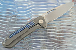 A glass bead blasted grade 5 titanium frame ensures this mid-size folder will be light in the pocket, yet have tremendous strength and durability. Each side features blue woolly mammoth molar inlay. The ancient tooth has a a nice mix of blue and white tones. Screws throughout were made in the Arno Bernard workshop and are grade 4 titanium, allowing them to be anodized. Ensuring rigid, yet light construction, the backspacer is grade 5 titanium.