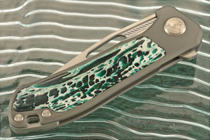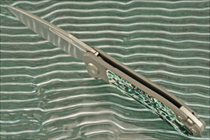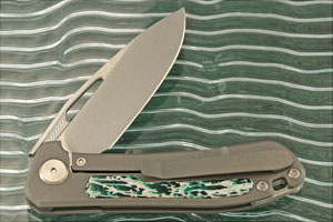 A glass bead blasted grade 5 titanium frame ensures this mid-size folder will be light in the pocket, yet have tremendous strength and durability. Each side features a stabilized and dyed kudu horn inlay. The stabilized inlay is formed from the interior of the kudu horn and combines green and cream tones. Screws throughout were made in the Arno Bernard workshop and are grade 4 titanium, allowing them to be anodized. Ensuring rigid, yet light construction, the backspacer is grade 5 titanium.