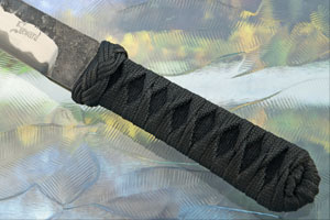 The tang is wrapped with black nylon cord. This is a technique called Tsuka-Ito. The wrapping culminates in a turks head knot, locking your hand behind the blade.