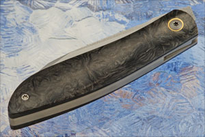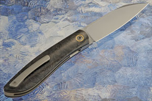 Handle scales are marble carbon fiber set on vapor blasted titanium liners. The liners surround a matching vapor blasted titanium backbar. The contoured handle fills your hand and provides a comfortable grip. The knife is completed with a 3D machined titanium pocket clip mounted for right-side, tip-up carry.