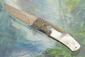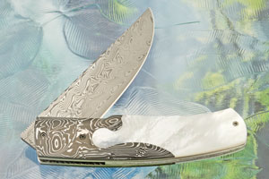 Handle scales combine presentation grade whitelip mother of pearl with aluminium foil layered Frozen Island carbon fiber made by Valley Composite Materials. The two exotic materials are fit beautifully in an elegant keyhole shape. Titanium liners are polished and surround a polished and hand engraved titanium backbar.