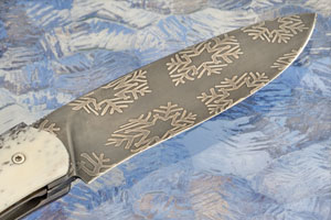 The drop point blade is made from Tim's own snowflake mosaic damascus forged from carbon steels to ensure excellent edge holding and chip resistance. The high contrast pattern is extremely engaging. The flat ground blade is razor sharp. We recommend using camellia oil to help protect the blade from rust. Tim's touchmark is on the left side of the blade.