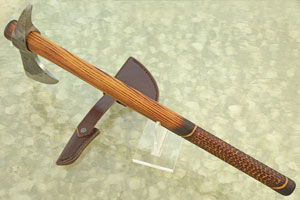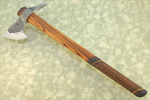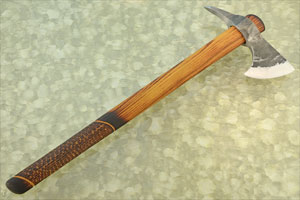 The haft is hand carved ash, finished with boiled linseed oil. The ash nicely complements the forge textured blade giving the tomahawk an old world feel. The haft is tapered to provide excellent balance for throwing and chopping. The bottom of the haft is jigged for additional grip.