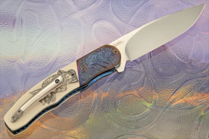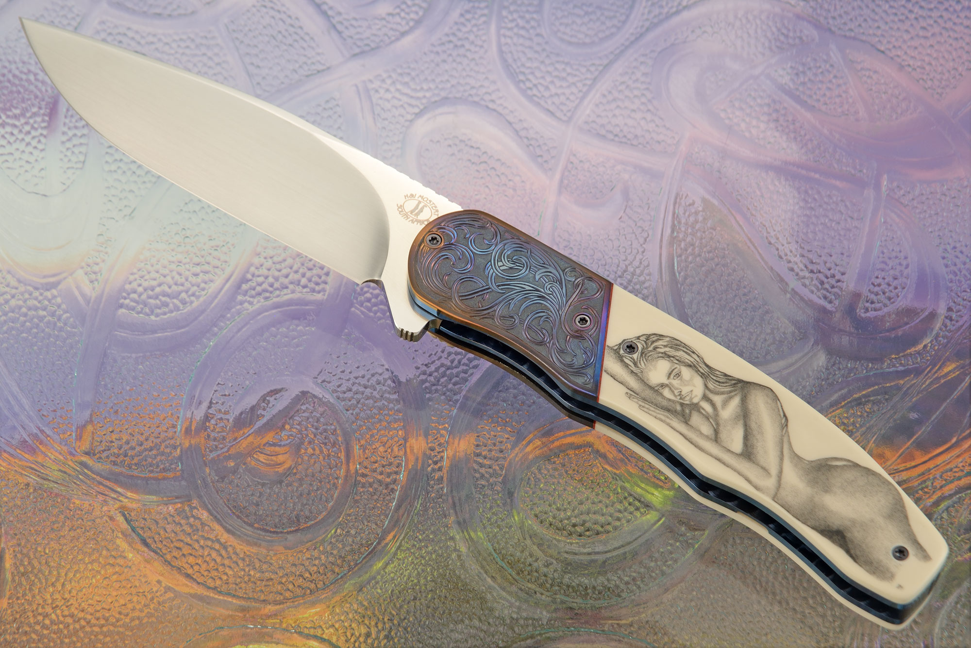 Handle scales are an imitation ivory called Juma made by Bachmann in Germany. The scales are meticulously scrimshawed by Ida Mostert. The scales meet perfectly with hand engraved and heat colored zirconium bolsters. Blue anodized titanium liners surround a black G-10 backspacer. The 3D machined titanium pocket clip with ball bearing retention ball is mounted for right-side, tip-up carry.