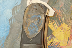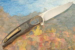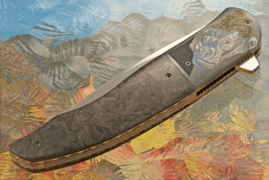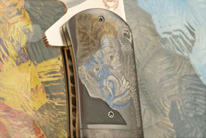 Handle scales are copper infused marble carbon fiber perfectly fit to heat colored zirconium bolsters. The bolsters are hand engraved by Ida Mostert. The gorilla theme is extremely realistic, showing off her incredible engraving skills. Anodized and hand fileworked titanium liners surround a hand engraved titanium backspacer. The anodized titanium pocket clip with ceramic retention ball is mounted for right-side, tip-up carry.