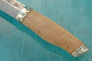 The handle is stabilized curly maple. It swells at the palm to provide a comfortable, secure grip. The front and back of the handle are sealed with nickel silver bolsters and hand engraved by Kevin.