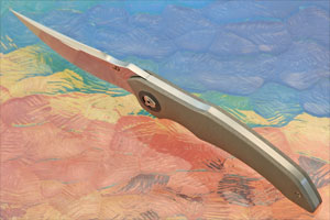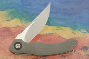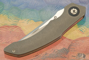 Stonewashed titanium handle scales are set on a 316 stainless steel spring. Fluted titanium pivot collars are darkened. The lightly contoured handle provides a comfortable grip.