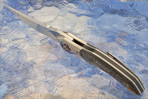 Handle scales are blue/silver twill carbon fiber set on satin finished titanium liners. The scales meet with brushed titanium bolsters in an elegant curve. Black Timascus pivot collars surround the torx pivot. The 3D machined titanium pocket clip is mounted for right-side, tip-up carry.