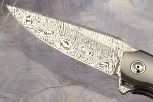 The blade is hand ground stainless damascus forged by Damasteel in Sweden. This high performing damascus is created using powder metallurgical steel manufacturing to provide excellent edge retention and unmatched beauty. A deep etch gives the blade particularly good contrast.