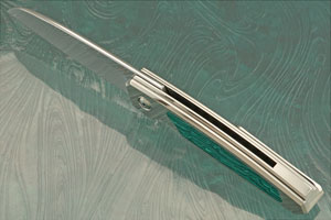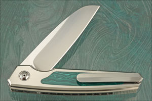 The frame is polished Gr5 titanium with malachite inlays. The external titanium pivot is surrounded by a titanium pivot collar. The 3D machined titanium pocket clip is mounted for right-side, tip up carry.