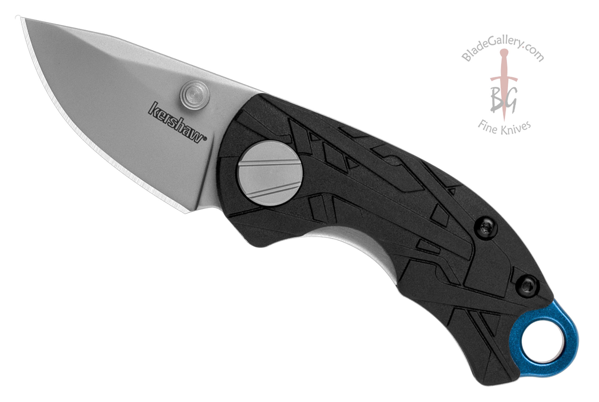 Designed by Jens Anso, the Kershaw Aftereffect (1180) is designed as a small, light-weight folding knife that can ride easily in a pocket or on a keyring. The black glass-filled nylon handle has unique texturing to provide a sure grip. An anodized aluminum backspacer culminates in an oversized lanyard hole. Steel liners give the knife strength and form the liner-lock mechanism. The pocket clip is mounted for right side, tip-up carry. The blade is easily opened using dual thumbstuds.
