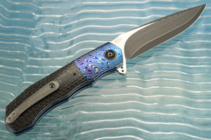 Handle scales are silver strike carbon fiber. Jimping on the thumb ramp provides a comfortable, secure grip. The gently rounded handle feels sturdy and fills your hand perfectly. This combination nicely complements the bolsters made from Timascus (titanium damascus). The heat colored zirconium custom pivot is surrounded by custom zirconium pivot collars. The handle is completed with differentially anodized and fileworked titanium liners. Screw hardware is TiAlN coated throughout. The 3D machined titanium pocket clip with ceramic retention ball is mounted for right side, tip-up carry.
