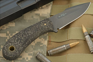 The 3-1/2 inch blade is 80CrV2 carbon steel, providing extreme toughness and excellent edge holding. The blade features a black oxide finish to prevent light reflection. The flat grind is razor sharp. Because the knife is made from carbon steel, we recommend using camellia oil to prevent oxidation.