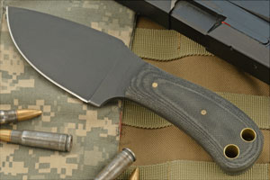 Black Micarta handle scales are secured to a full tang using brass pins and lanyard tubes. The contoured handle provides a comfortable grip with no hot spots. Despite its compact shape, this knife features a thick tang and spine for excellent durability.