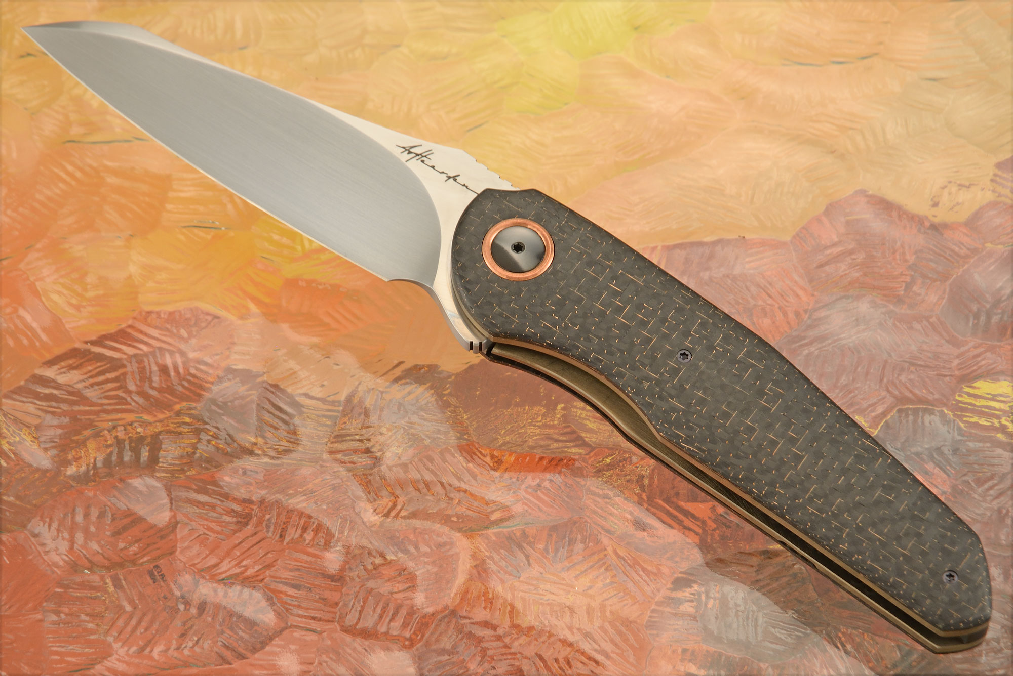 Handle scales are lightning strike carbon fiber. The custom external pivot is heat colored zirconium and is surrounded by a copper pivot collar. Jimping on the thumb ramp aids grip. The gently rounded handle feels sturdy and fills your hand perfectly. Bronze anodized titanium liners surround a carbon fiber backbar. The 3D machined zirconium pocket clip is mounted for right-side, tip-up carry.
