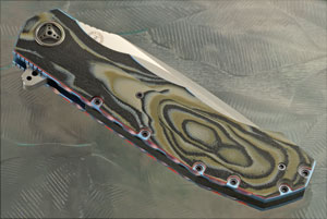 Handle scales are camouflage G-10. The custom heat colored zirconium pivot and collar add contrast. Jimping on the thumb ramp aids grip. The flipper doubles as a guard that keeps your hand from sliding forward onto the blade. The gently rounded and 3D contoured handle feels sturdy and fills your hand perfectly. It is completed with anodized, fileworked titanium liners that elegantly contrast against the scales and carbon fiber backspacer. The 3D machined titanium pocket clip is mounted for left-side, tip-up carry and features a ceramic ball for excellent pocket retention.
