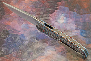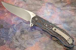 Handle scales are Nebula FatCarbon. The custom heat colored zirconium pivot and collar add contrast. Jimping on the thumb ramp aids grip. The flipper doubles as a guard that keeps your hand from sliding forward onto the blade. The gently rounded and 3D contoured handle feels sturdy and fills your hand perfectly. It is completed with anodized, fileworked titanium liners that elegantly contrast against the scales and carbon fiber backspacer. The 3D machined titanium pocket clip is mounted for left-side, tip-up carry and features a ceramic ball for excellent pocket retention.