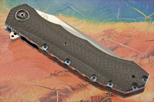 Handle scales are microtextured carbon fiber. The custom heat colored zirconium pivot and collar complement the scales nicely. Jimping on the thumb ramp aids grip. The flipper doubles as a guard that keeps your hand from sliding forward onto the blade. The gently rounded and 3D contoured handle feels sturdy and fills your hand perfectly. It is completed with anodized, fileworked titanium liners that elegantly contrast against the scales and carbon fiber backspacer. The 3D machined titanium pocket clip is mounted for left-side, tip-up carry and features a ceramic ball for excellent pocket retention.
