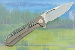 A glass bead blasted grade 5 titanium frame ensures this mid-size folder will be light in the pocket, yet have tremendous strength and durability. Each side features green woolly mammoth molar inlay. The ancient tooth has a a nice mix of blue and white tones. Screws throughout were made in the Arno Bernard workshop and are grade 4 titanium, allowing them to be anodized. Ensuring rigid, yet light construction, the backspacer is grade 5 titanium.