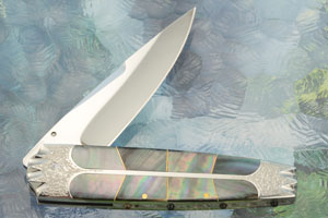 Hand satin finished 420 stainless steel handle scales are inlaid with sections of blacklip mother of pearl. The front and rear 'bolster' area features a hand hammered finish (called tsuchime in Japan). The backbar is hand fileworked and features blacklip mother of pearl inlays.