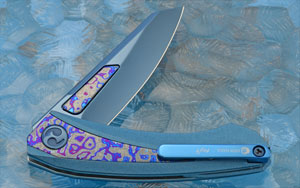 Handle scales are copper with an irosabi blue finish. Matching Zirmascus inlays are on both sides of the handle. The screw hardware throughout is anodized titnaium. The scales are set on polished 420 stainless steel liners. The free floating copper backbar also has an irosabi blue finish. The 3D machined titanium pocket clip is mounted for right-side, tip-up carry. The clip is engraved with Dew's touchmark and “1 of 1”.