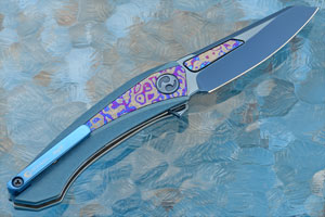 he Meteor Flipper is an exceptional knife. The blade is hand ground VG-10 stainless steel. VG-10 is a Japanese made, high-grade stainless steel that has been used in both culinary and pocket knives for decades. It has a wonderful balance of corrosion resistance, edge holding and strength that make it ideal for knives of all kinds. The blade is brought to a mirror polish and features a blue titanium coating. Zirmascus (zirconium/titanium damascus) forged by Vegas forge is inlaid into both sides of the blade.