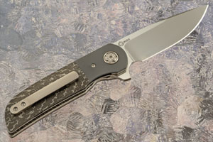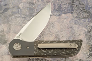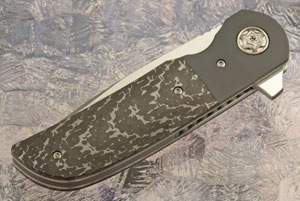 The handle scales are Silver Snakeskin FatCarbon. They are perfectly fit to blackened zirconium bolsters. Titanium liners surround a blackened zirconium backbar. The Rausch external pivot and pivot collar are brought to a high polish. The 3D machined titanium pocket clip is mounted for right-side, tip-up carry.