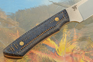 The handle is Kamari burlap Micarta set on a full tang using brass pins for strength and durability. The hand contoured handle provides a comfortable, non-slip grip. At only 3 ounces, you'll hardly notice this knife on your side until it’s time to use it.