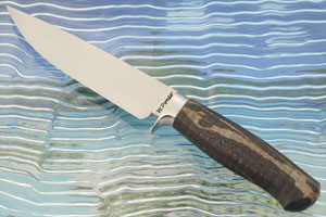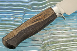 The handle is dyed and stabilized curly maple. The handle is sculpted to fill your hand and provide a comfortable, non-slip grip. The handle is heirloom fit to the blade ensuring there will be no sharp corners even if the wood shrinks slightly over the years. The handle is finished with a 416 stainless steel guard.