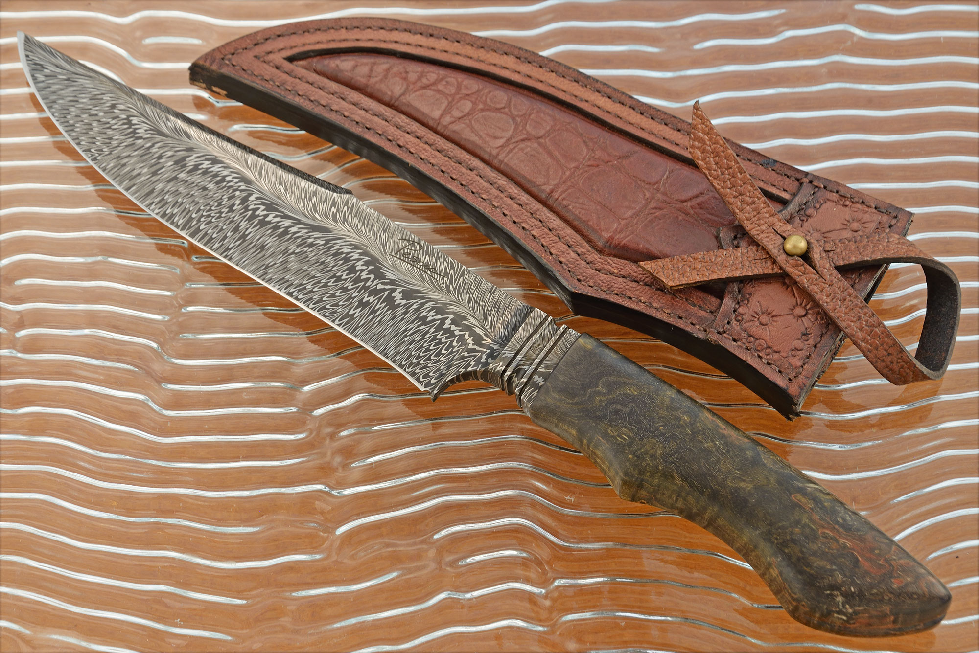 The hand fluted bolster is integral to the blade with the damascus pattern flowing from bolster to blade uninterrupted. Creating an integral bolster in a custom setting requires a particularly talented smith.
