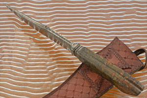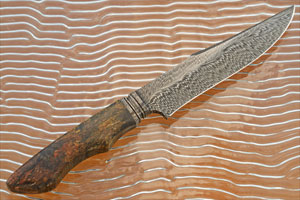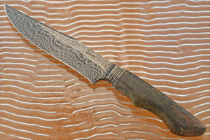 The 7-1/2 inch blade is forged from river of fire pattern damascus, forged from 1070 and 15N20 carbon steels. The river of fire pattern is perfectly controlled and shows his considerable skills in the forge. The high contrast pattern is easy to see even from a distance. Pescie's touchmark is on the left side of the blade. Because the blade is forged from carbon steel, we recommend using camellia oil to protect the blade from rust.