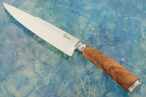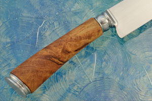The handle is thorn crown wood, hand contoured to provide a comfortable grip. A stainless steel pommel protects the handle if the knife is dropped and acts as a counter balance to the blade. The handle is heirloom fit to the bolster and butt cap to ensure a perfect fit over time.