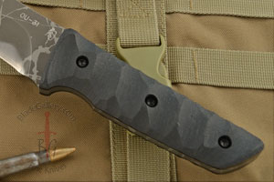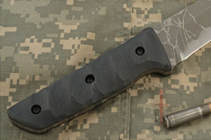 Black G-10 handle scales are set on the full tang with torx screws. This allows the scales to be removed if cleaning or maintenance is needed. The hand sculpted handle is very comfortable and provides plenty of tactile grip.