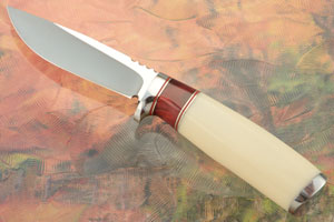 The handle combines alternative ivory with a red acrylic spacer, creating excellent contrast. It is completed with a stainless steel butt cap, guard, and spacers, giving it perfect balance in hand.
