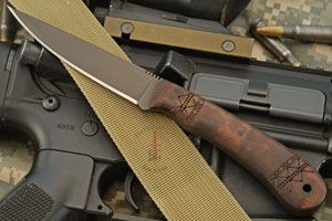 Tribal marked maple handle scales are set on the full tang. The handle provides a secure, comfortable grip.