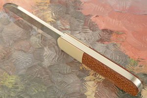 The blade on this Barlow Slipjoint Folder is hand ground N690 stainless steel. Bohler N690 ensures a keen, long lasting edge with good resistance to chipping. It is a great choice for high performance use knives. A hand rubbed satin finish lends an heirloom quality to Tinus' work. The straight cutting edge provides detail-oriented slicing.