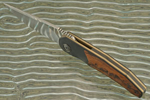 Handle scales are black G-10 inlaid with presentation grade desert ironwood. The scales are microtextured for a comfortable grip. Jimping on the thumb ramp provides an excellent thumb purchase. The gently rounded handle feels sturdy and fills your hand perfectly. The custom heat colored zirconium pivot is surrounded by a zirconium pivot collar. The handle is completed with anodized titanium liners and a carbon fiber backbar. The heat colored zirconium pocket clip is mounted for right-side, tip-up carry.