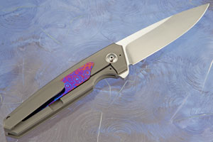 The handle is beat blasted titanium with a sturdy framelock. Timascus (titanium damascus) is inlaid into the show side of the frame. The pivot and pivot collars are mirror polished. The titanium backspacer is also brought to a high polish. The 3D machined titanium pocket clip is mounted for right-side, tip-up carry.