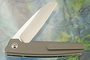 Handle scales are bead blasted titanium set on polished titanium liners. Three sections of abalone are set in window frames on the show-side scale. The titanium liners a jewel polished in the interior and surround a matching polished titanium backbar. The 3D machined titanium pocket clip is mounted for right-side, tip-up carry.