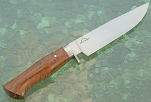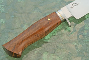 The handle is hand contoured curly koa wood (acacia koa). This stabilized wood is only found on the Hawaiian Islands and is one of the most desired woods used in knifemaking. Its chatoyant curly figure is unrivaled. Chittum burl accent plugs surround the brass pin. The 416 stainless steel and fileworked brass guard protects your hand from sliding forward.