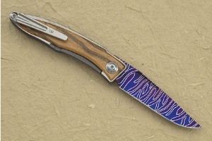 Description: This Mnandi combines the Integral Lock©, titanium frame, and sleek styling found on the series and takes off from there. This departure from the ordinary features scales of bocote wood, prized for it's rich, high-contrast color. The blade is Gary House's Zebra pattern Damascus, heat blued to intense blue and purple with bright pure nickel streaks. The striking figuring of scales and blade make this a spectacular special edition of Chris Reeve's Mnandi.