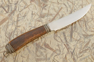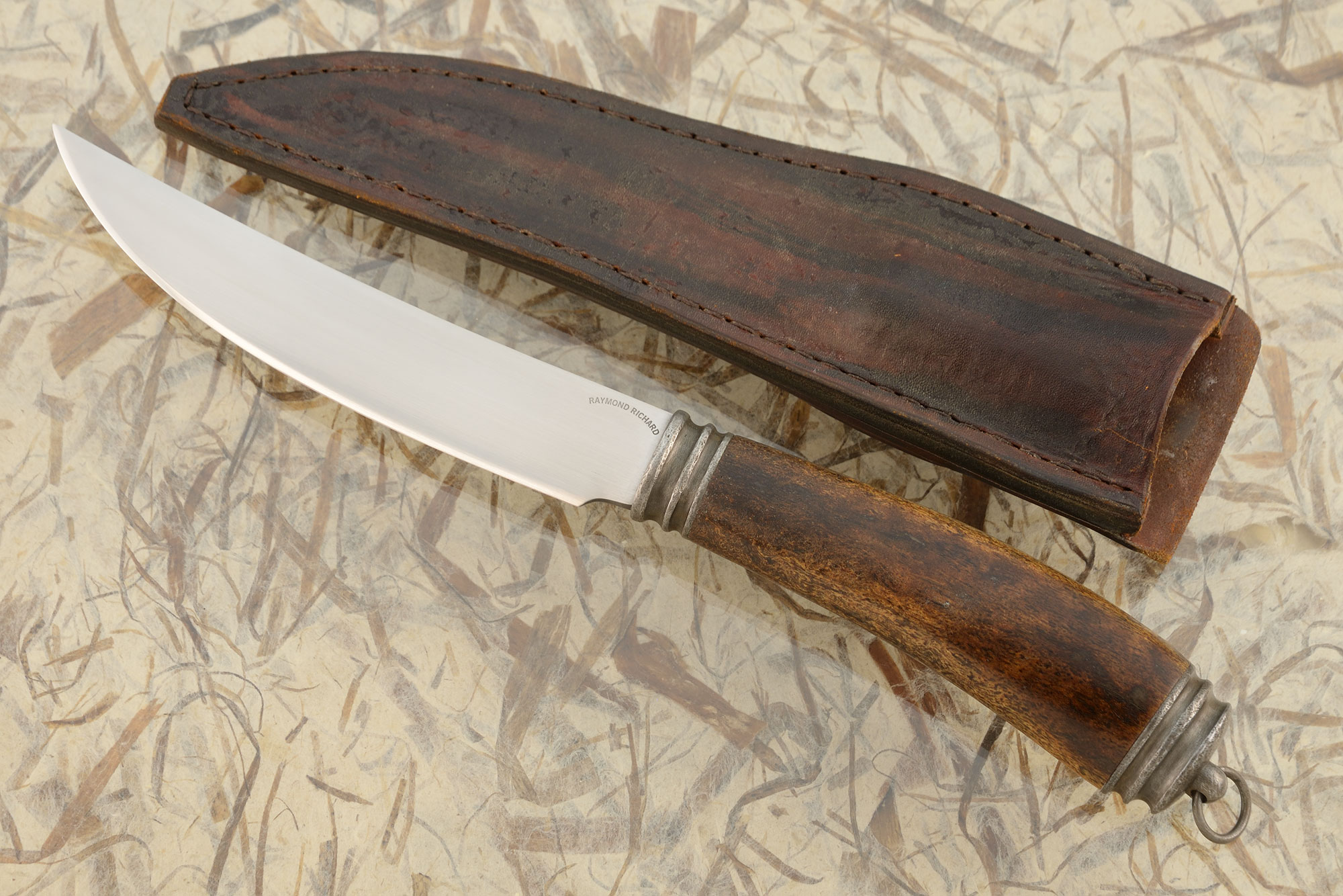 Description: This camp knife is an exceptional example of Raymond Richard's work. It has an elegance and timeless sense to it that wouldn't be out of place by the side of an American pioneer, bravely breaking ground in a new land. It captures the spirit of a time gone by - yet has the excellence one expects from a contemporary knifemaker. This knife was kept in a private collection since it was made in the spring of 2005. It is in brand new condition and by all appearances Raymond could have made it yesterday! This is Richard's work at its absolute best.