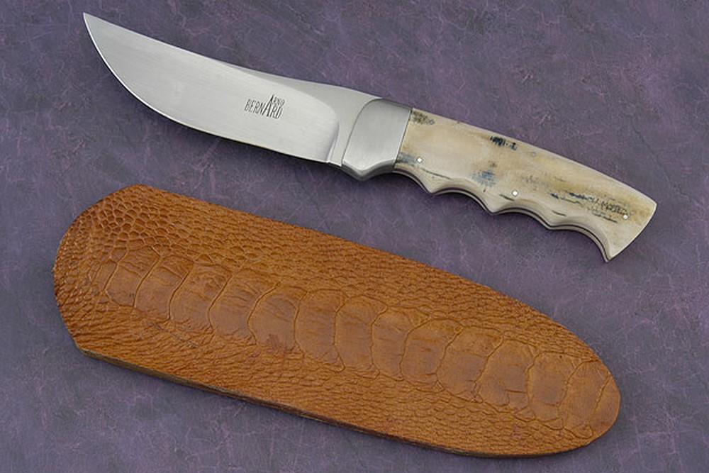 Description: This elegant mammoth ivory hunter by Arno Bernard has a dramatic South African feel and look. The mammoth ivory has been polished to a luster and is pinned with five stainless steel pins. The mammoth ivory shows off blue and cream tones. Finger grooves result in a sure, comfortable grip. A distal tapered tang assures a perfect balance in the hand. The blade has been differentially hand satin finished to accentuate the dramatic grind lines. As at home in a collection as out in the field. Excellent fit and finish throughout.