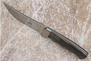 Description: This elegant mammoth ivory hunter by Arno Bernard has a dramatic South African feel and look. The mammoth ivory has been polished to a luster and is pinned with five stainless steel pins. Finger grooves result in a sure, comfortable grip. A distal tapered tang assures a perfect balance in the hand. The blade has been hand satin finished in the grinds and mirror polished on the flats to accentuate the dramatic grind lines. As at home in a collection as out in the field. Excellent fit and finish throughout.