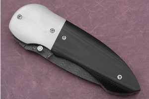 Description: The Saber Tooth is an exceptional carry piece that will also feel at home in any collection. The blade is formed from Devin Thomas stainless Damascus. The grinds nicely show off the patterns. The blade has silky smooth action and is easily opened using the cubic zirconia thumbstud. A long clip results in a very aggressive point. The bolsters and black linen micarta scales have been gently arched for a very comfortable feel in the hand. Titanium liners. Exceptional fit and finish throughout with a perfectly centered blade.