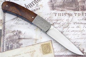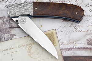 Description: South African knifemaker André Thorburn creates an exceptional folder at an amazingly low price. The blade is perfectly centered and silky smooth -- easily opened with the thumbstud. The drop point 12C27 stainless blade is meticulously hand satin finished. 304 stainless steel bolsters are textured, providing a secure thumb rest. Blue anodized titanium liners surround a 12C27 stainless steel back spacer. The scales are Arizona desert ironwood, showing off deep, rich tones and a swirling grain structure. Red fiber spacers allow the blade to adjust to temperature and humidity changes. Exceptional work throughout.