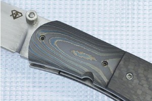 Description: Black carbon fiber accents bolsters forged from random pattern Damascus steel that has been heat colored to blue/green overtones. Carbon fiber is light weight, making this a knife that you will feel comfortable carrying. The blade is hollow ground ATS-34 stainless steel, an excellent all-around steel that takes and holds a good edge, while requiring little maintenance. Stainless pocket clip.
