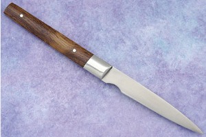Description: John Leitch's desk knives will feel as at home in a collection as they will on an executive's desk. The ATS-34 stainless steel blade was etched with a relief for his maker's mark. This results in a "satin finish" that has made his work well known. The ATS-34 stainless steel blade was heat treated by Paul Bos to Rc 59 and will have exceptional edge holding. The fit between nickel silver bolsters and rosewood scales is excellent -- without a perceptible seam. Exceptional work throughout!