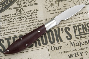 Description: John Leitch's paring knife will feel as at home in a collection as they will in the kitchen. The ATS-34 stainless steel blade was etched with a relief for his maker's mark. This results in a "satin finish" that has made his work well known. The ATS-34 stainless steel blade was heat treated by Paul Bos to Rc 59 and will have exceptional edge holding.