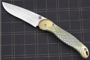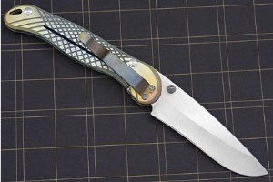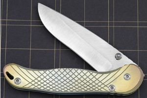 The Talonite is matched to differentially anodized titanium scales. The titanium keeps the knife light and fast. Machining on the surface provides a secure grip. An open back makes it easy to keep the knife clean. Exceptional work throughout!